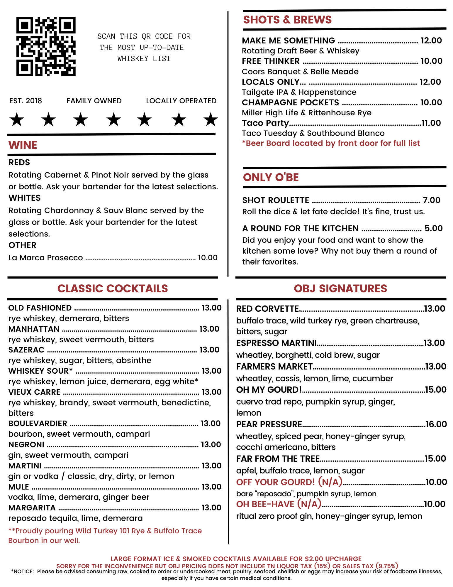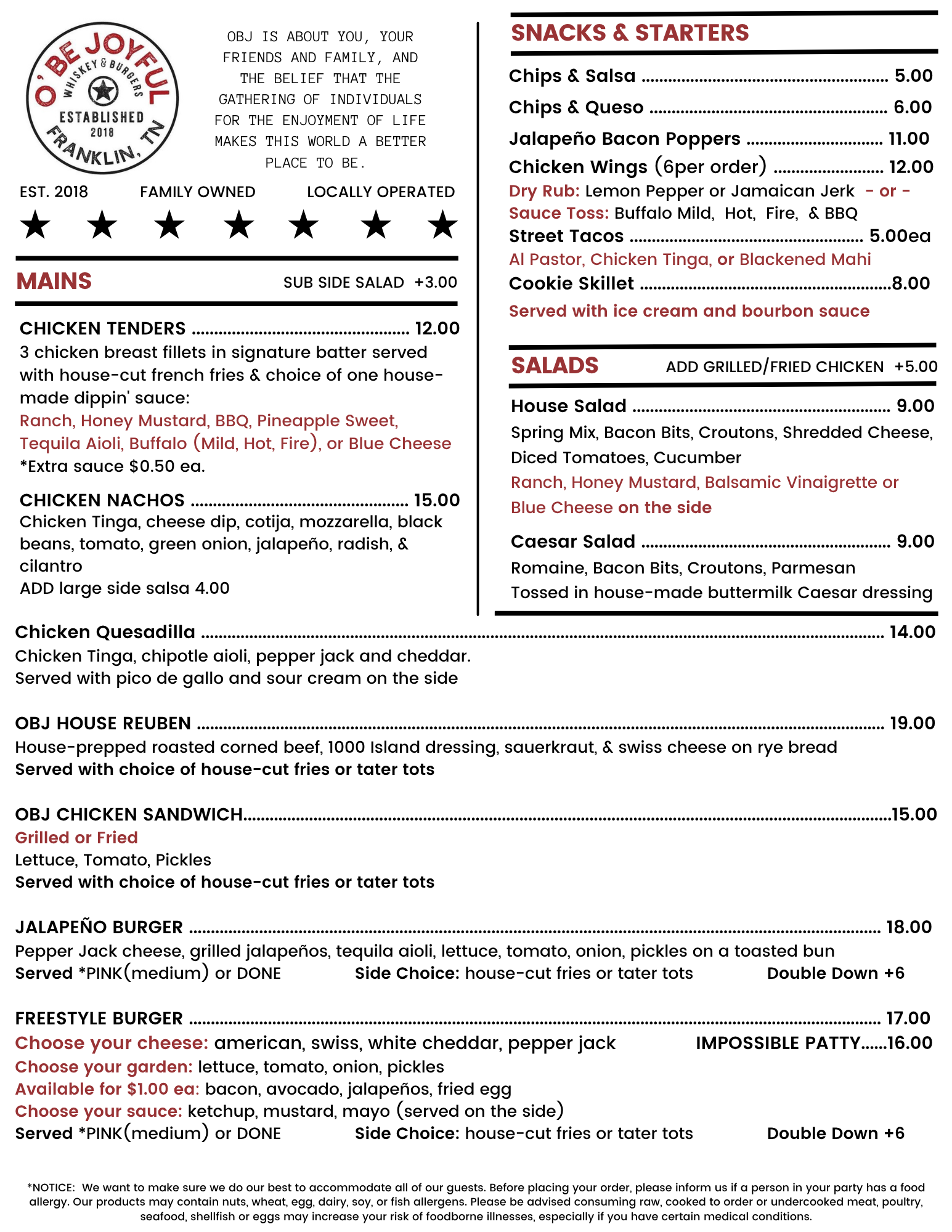 O’ Be Joyful is about you, your friends and family, and the belief that the gathering of individuals for the enjoyment of life makes this world a better place. Mixing old Southern values with a fresh contemporary vibe, OBJs Kitchen & Cocktails marries the perfect combination of service and flavor. Whether you desire an intimate lunch with an old friend or catching the game with the guys, OBJ will create your perfect experience.